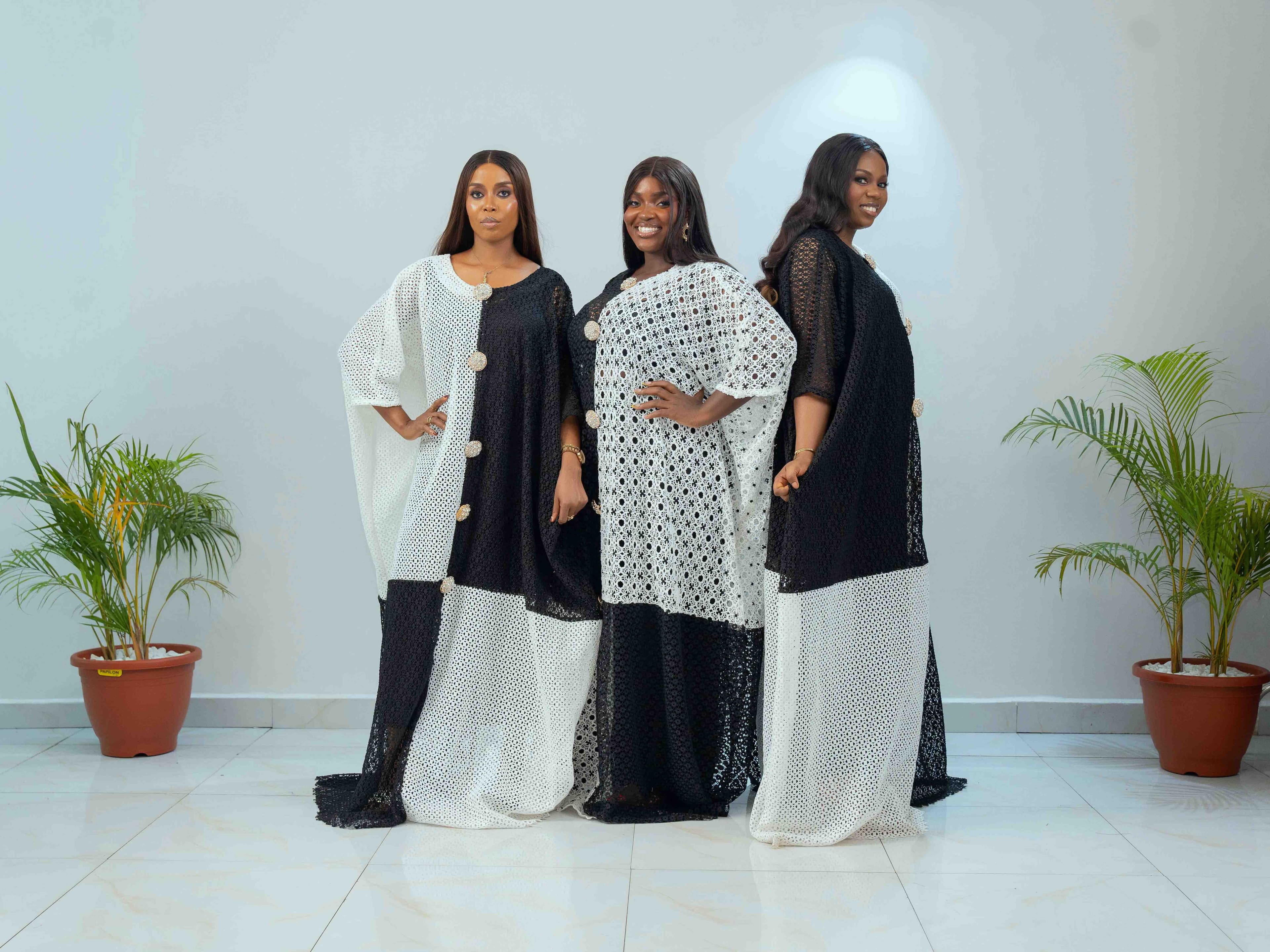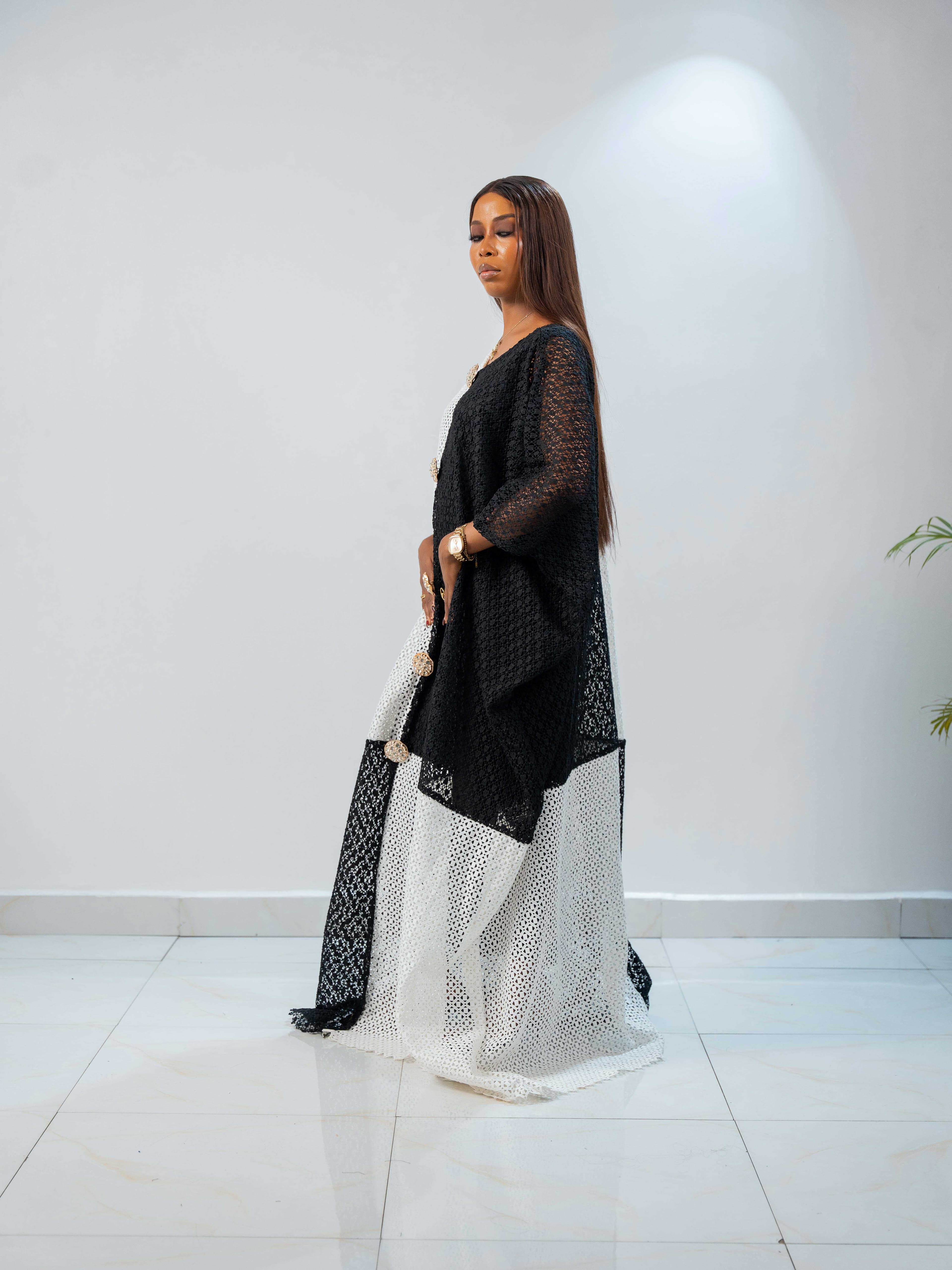 A bubu cord lace dress crafted in a rich mix of black-and-white lace patterns, finished with gold faux-button detailing for a touch of luxury. Designed for the beautiful woman who loves to stand out effortlessly, this piece blends elegance, comfort, and bold style in one stunning silhouette.