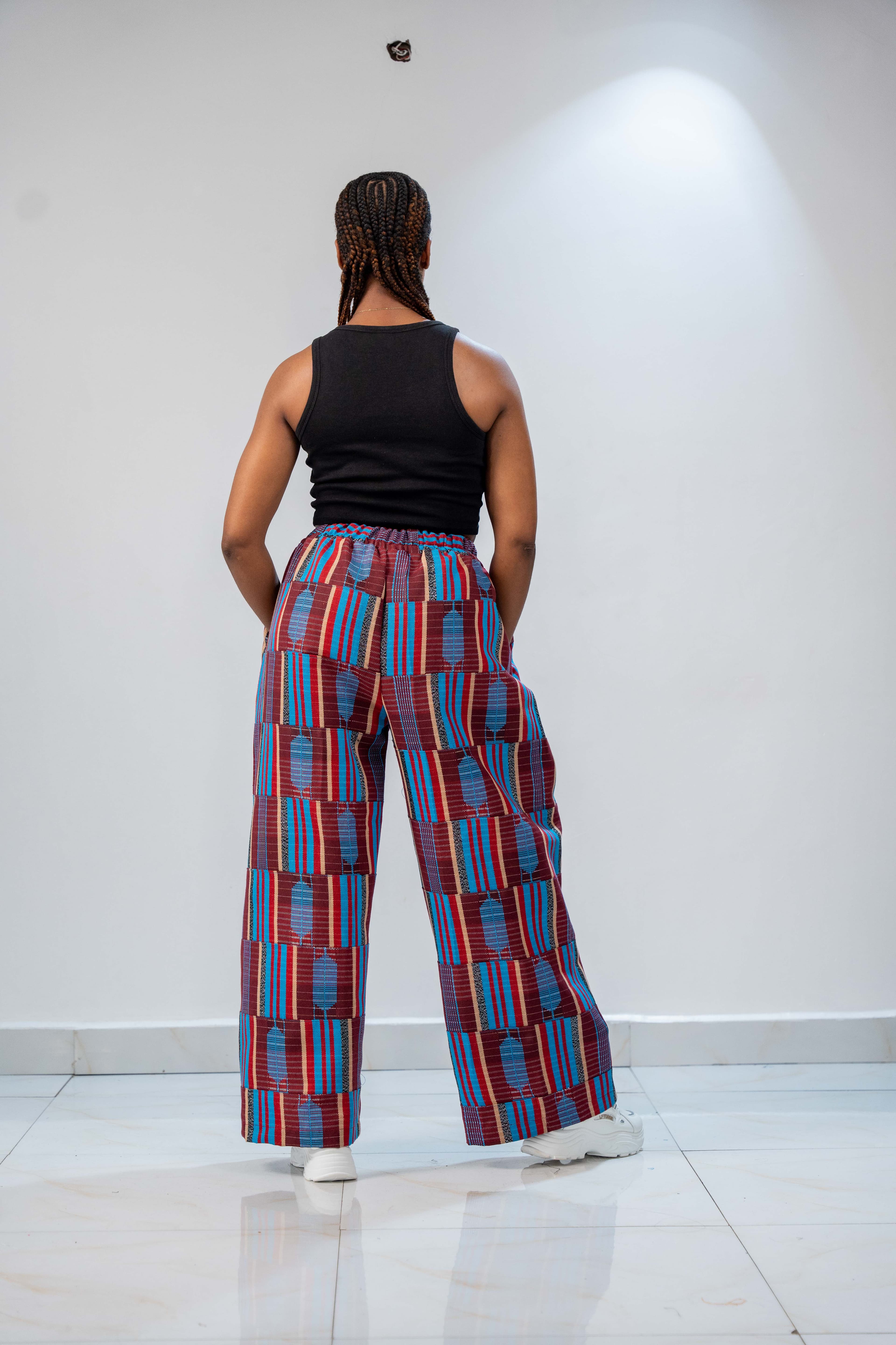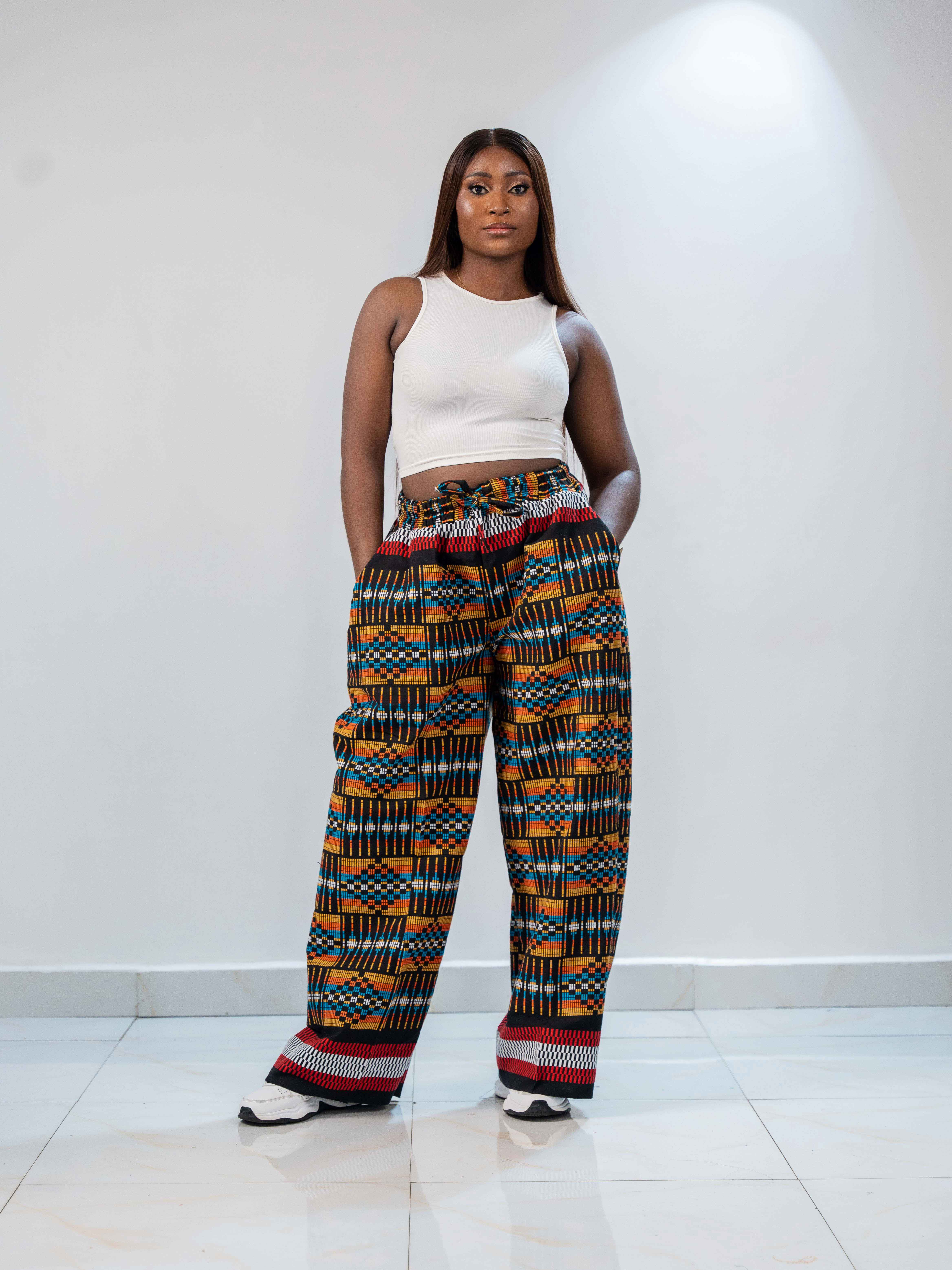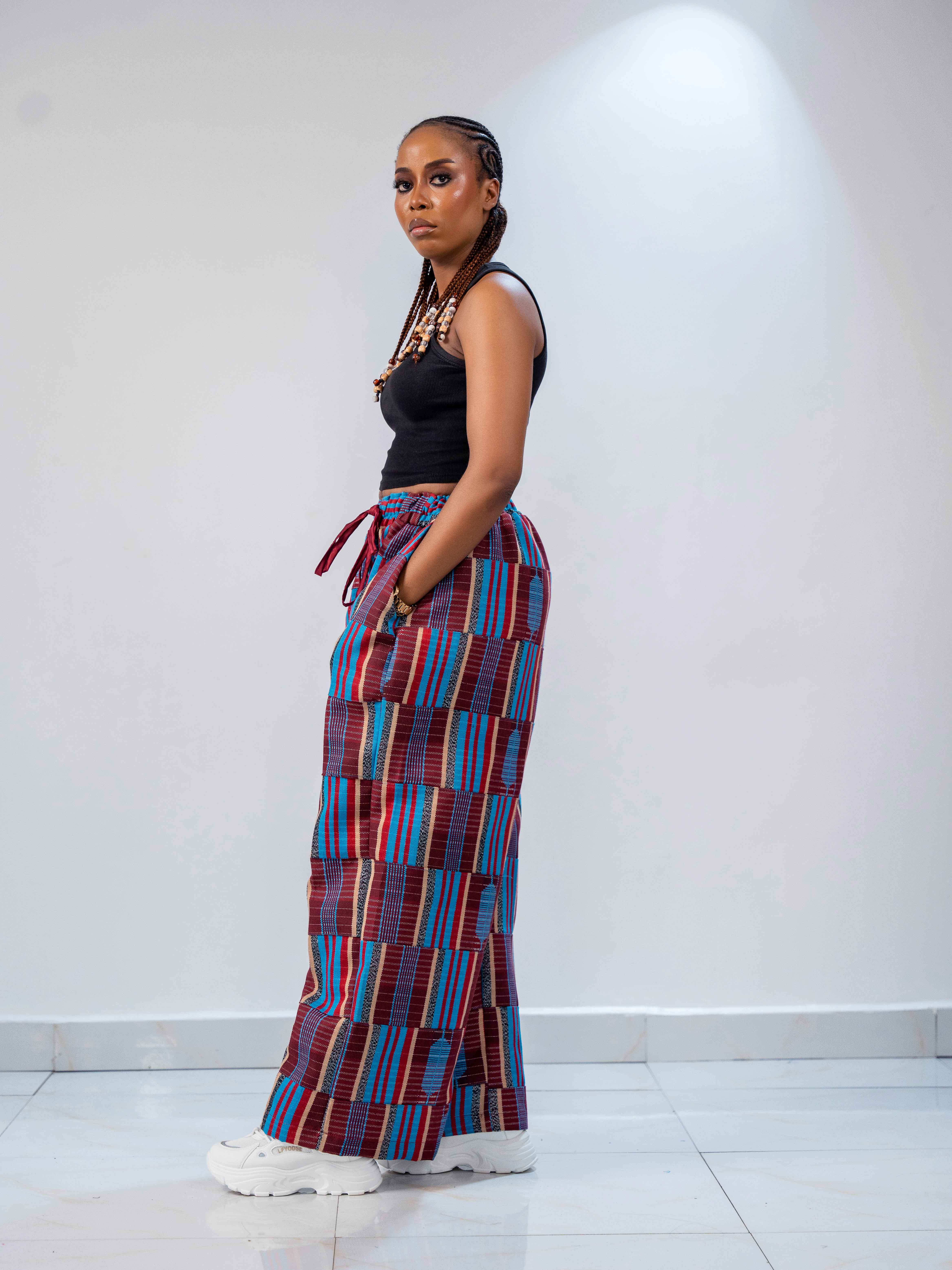 Made from Akwaete fabric with exaggerated hips and wide legs. Easy to style with different tops and jackets for a bold, stylish look.