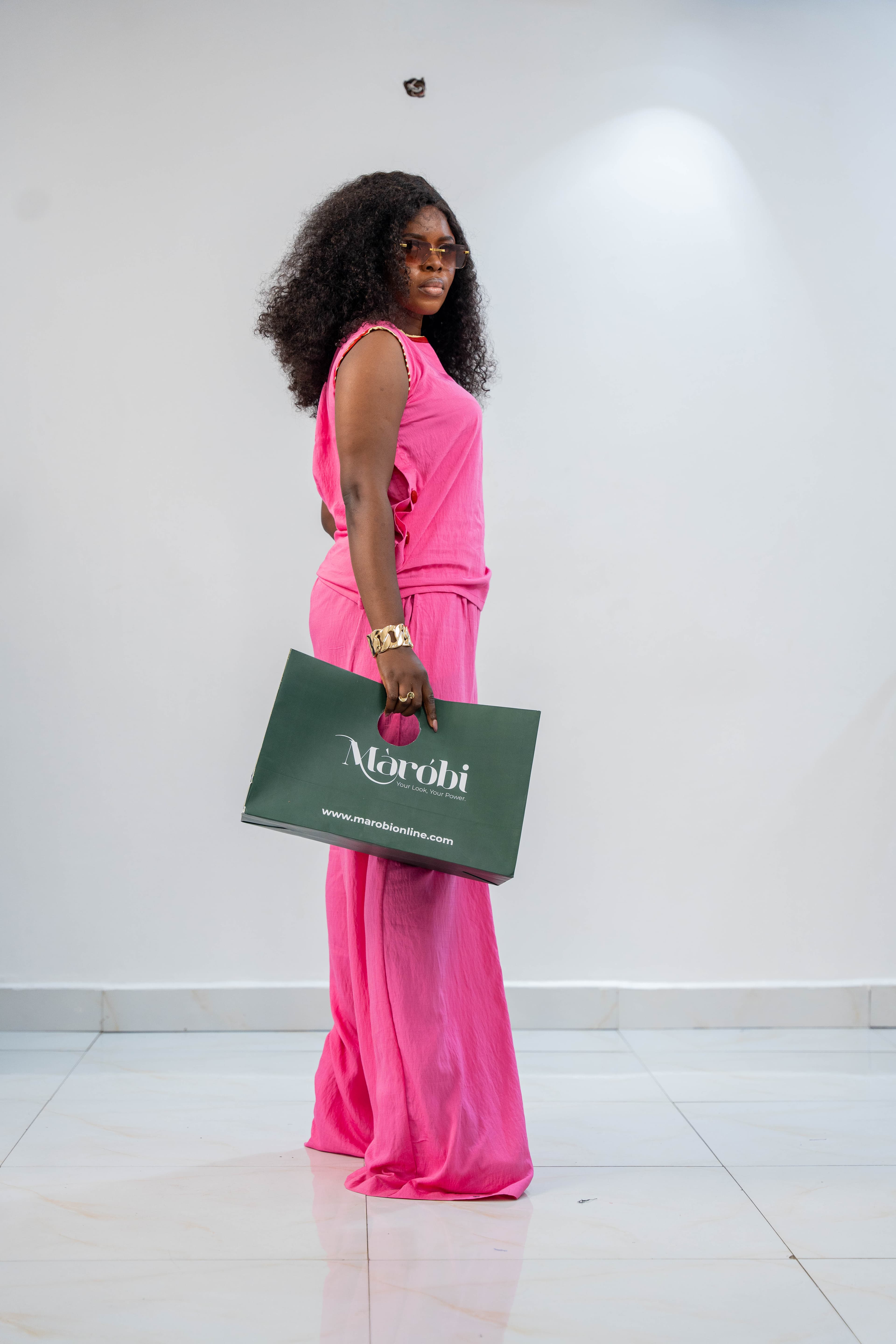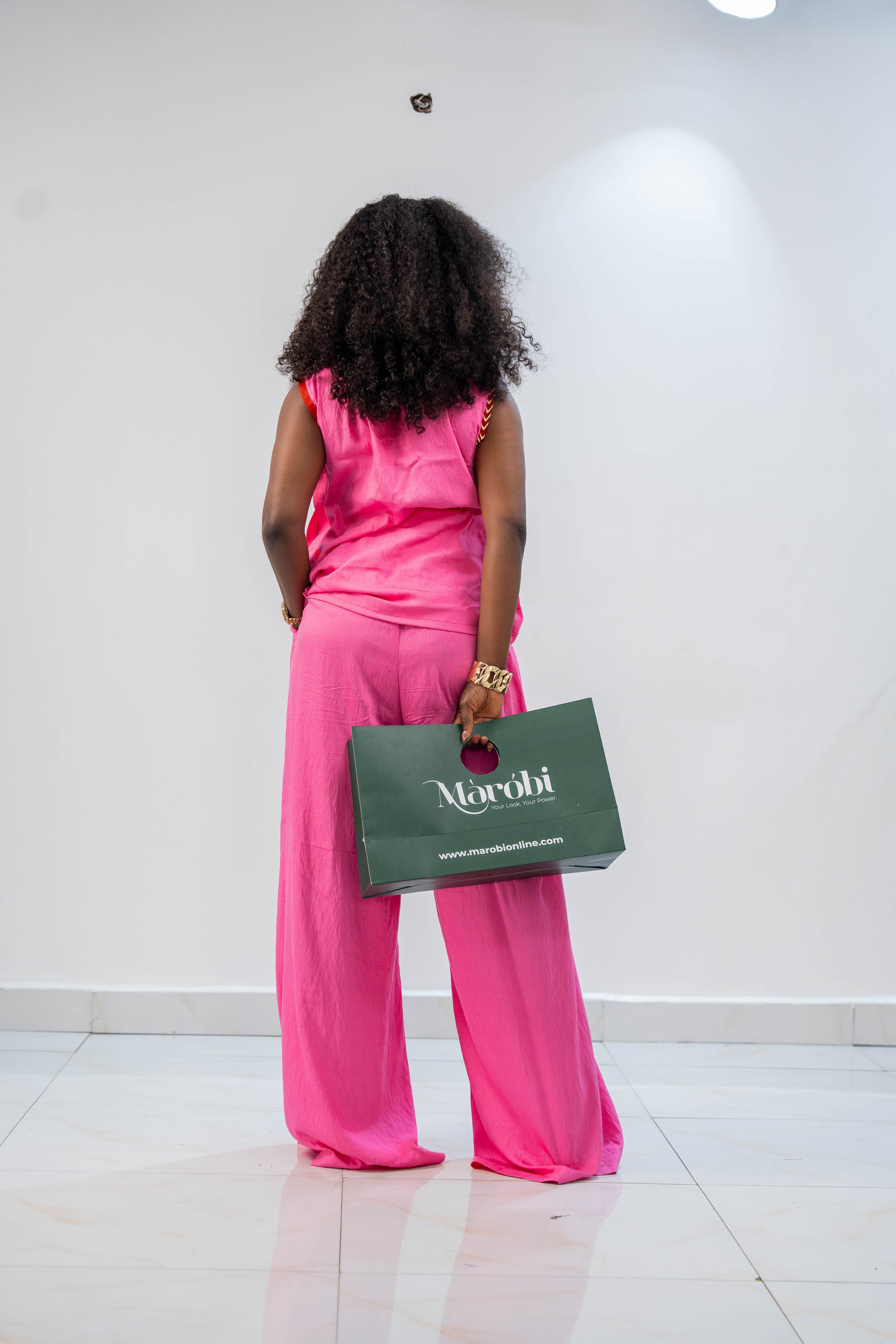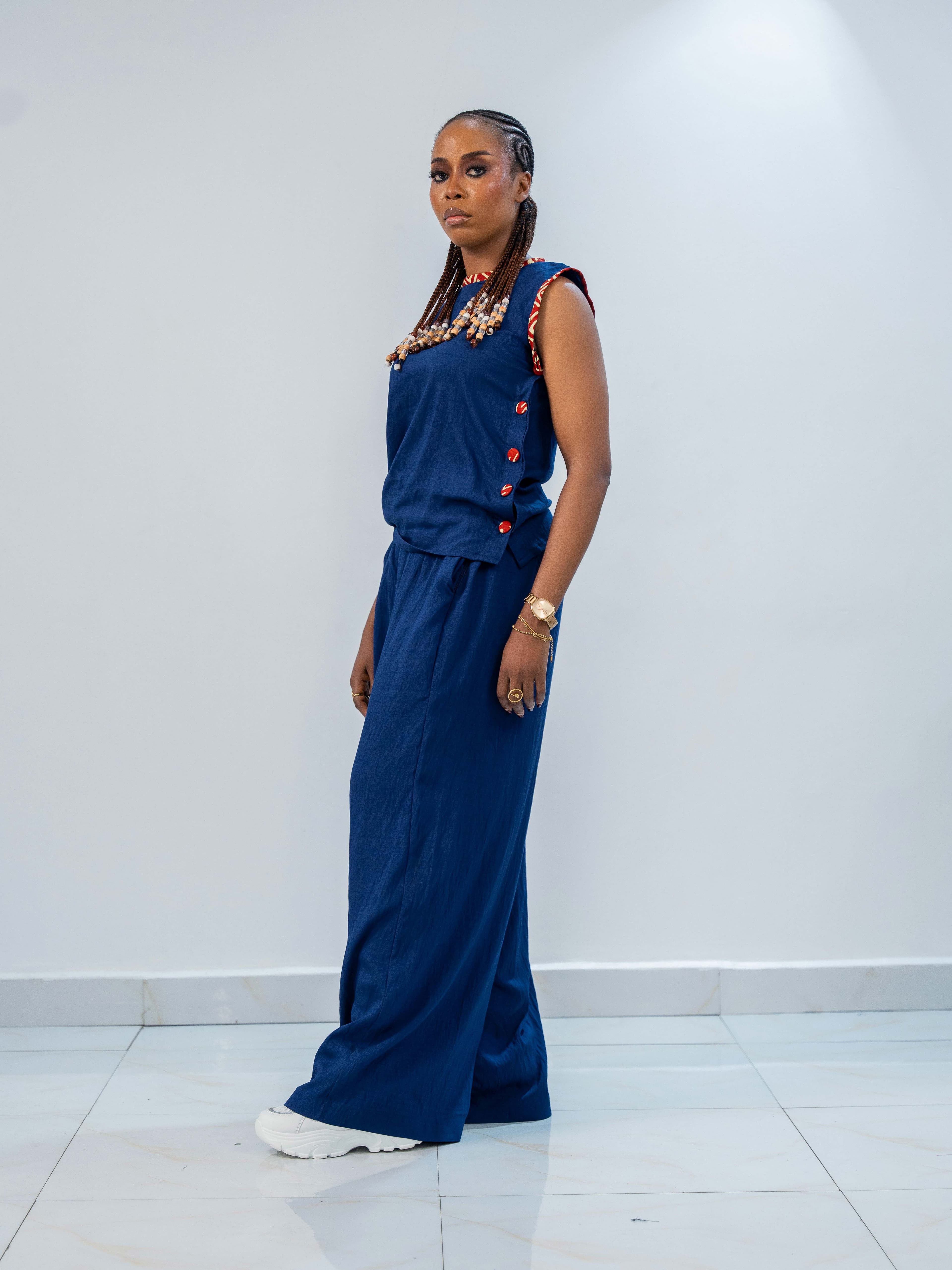 A sleeveless linen set featuring wide-leg trousers and Ankara-covered button details on both sides of the top. Finished with Ankara piping along the neckline and armholes for a subtle, stylish touch.