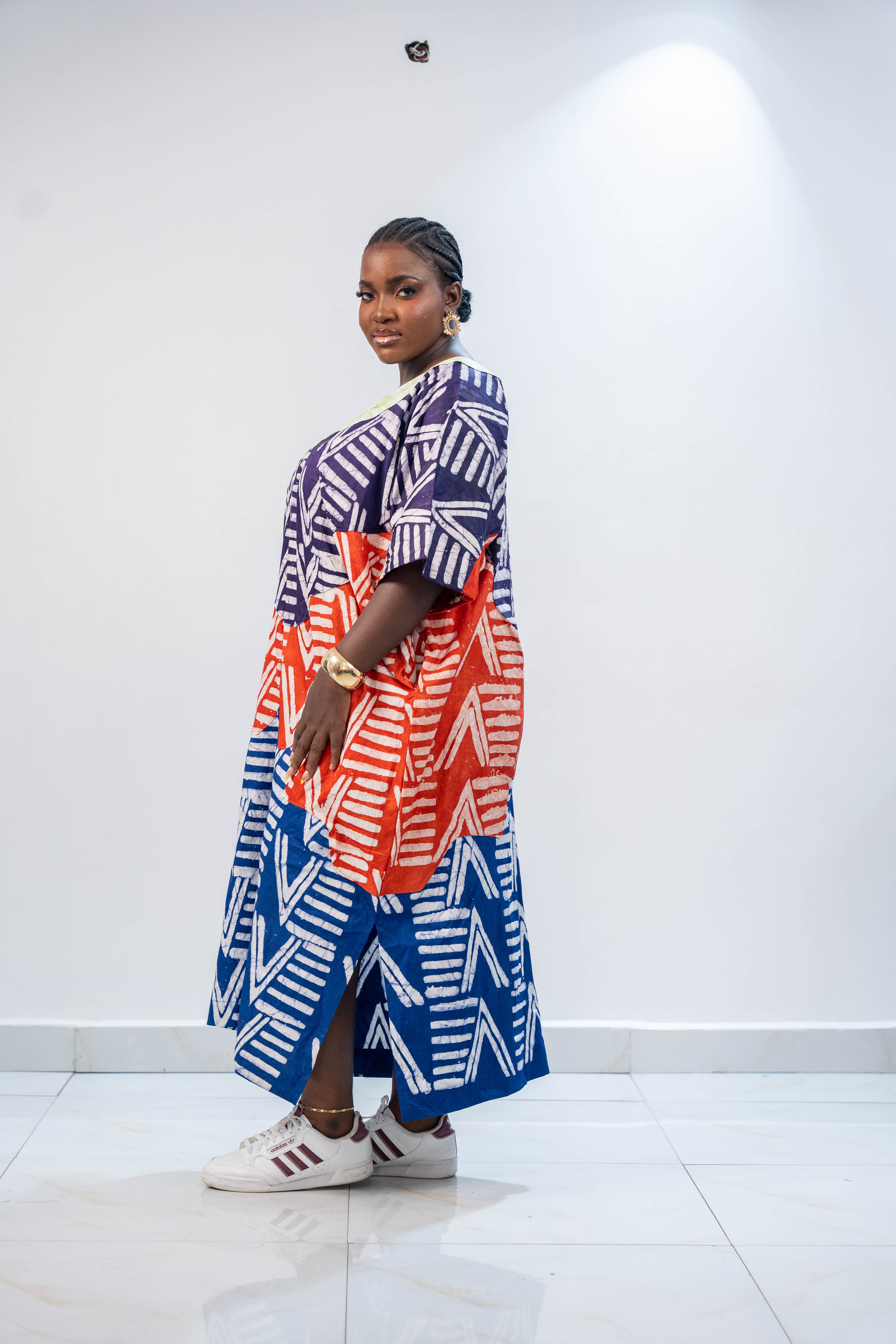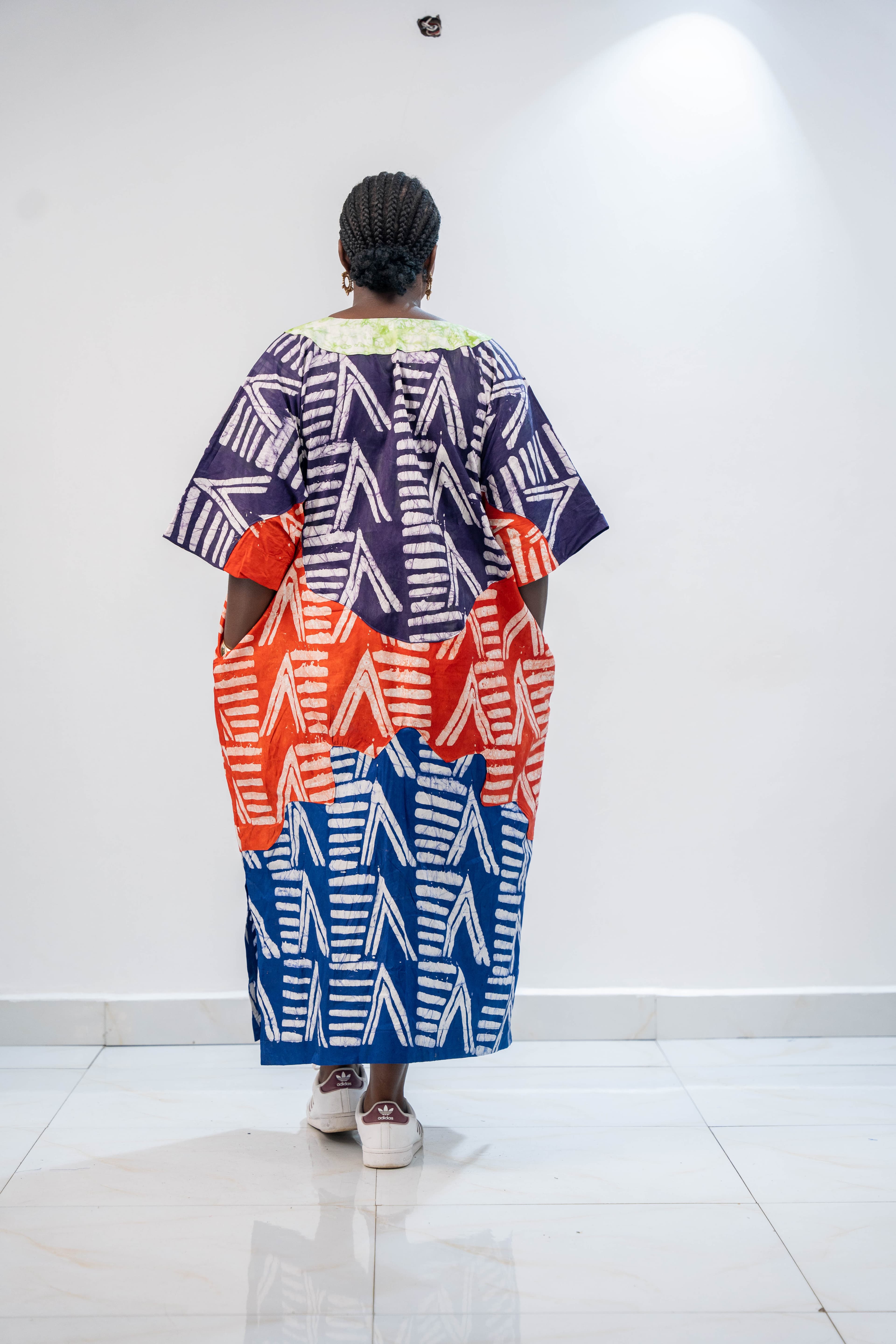 A vibrant multicolor Adire bubu featuring a wavy joining design and a flattering V-neckline. Easy, comfortable, and perfect for effortless style.