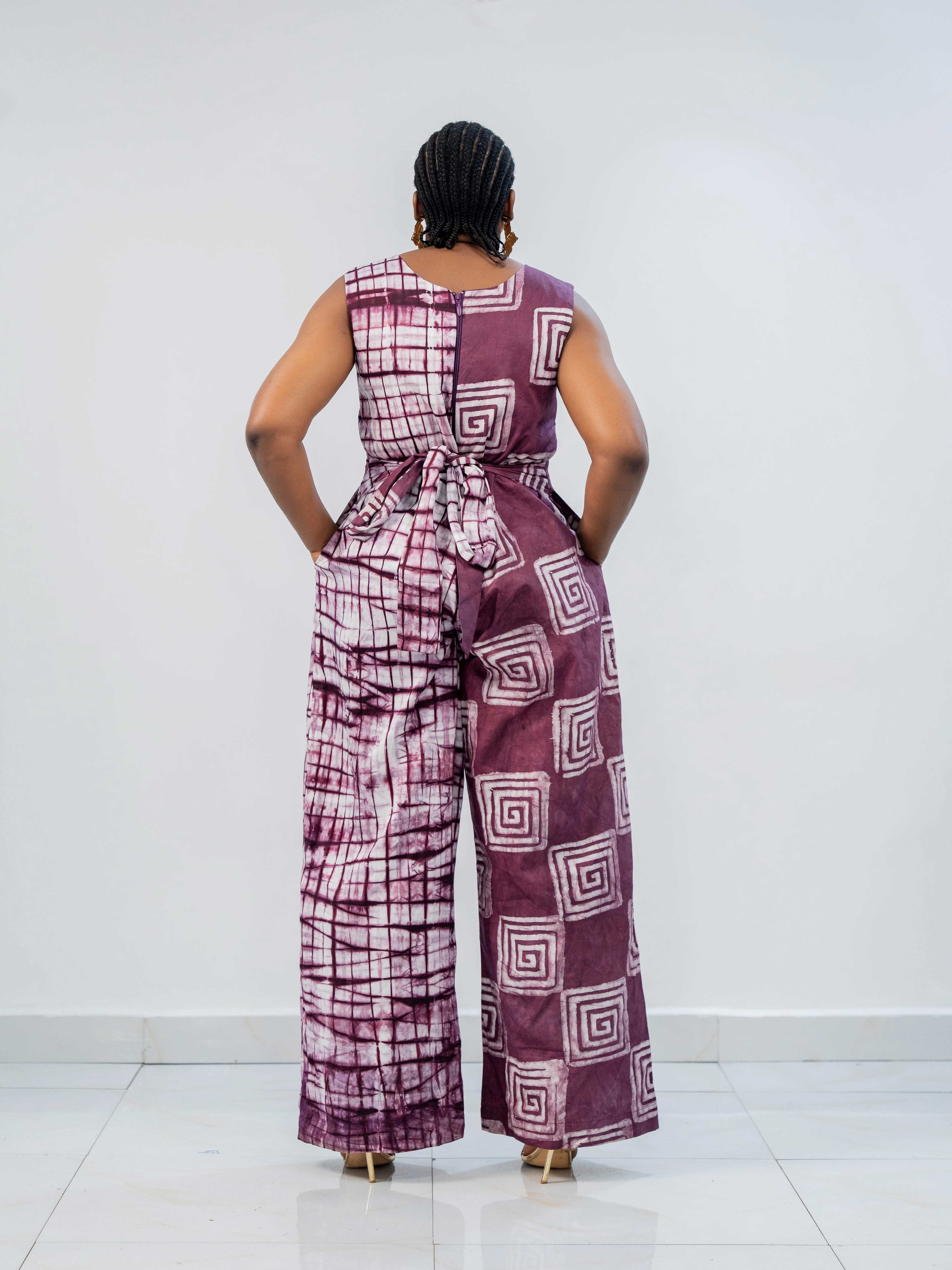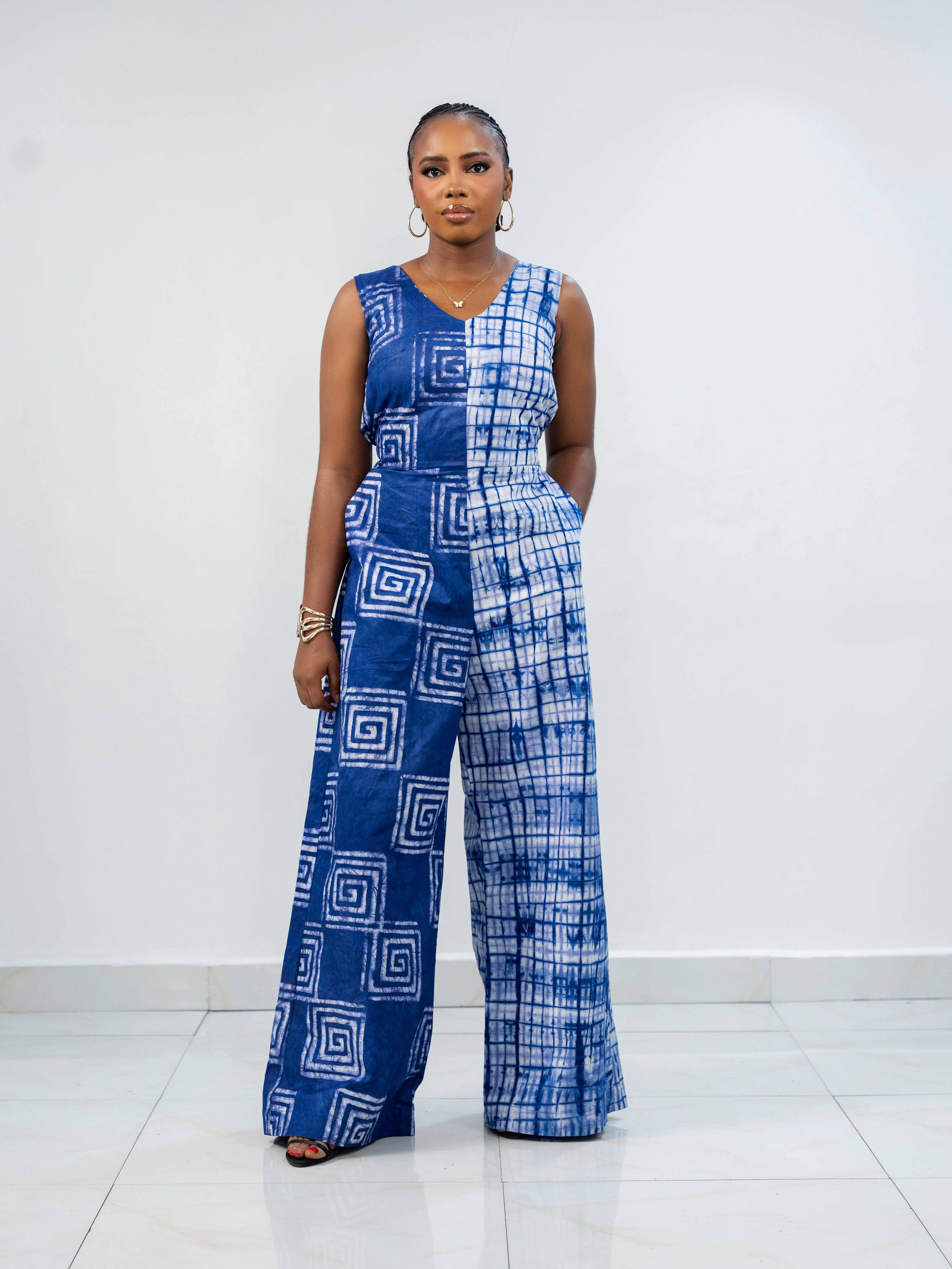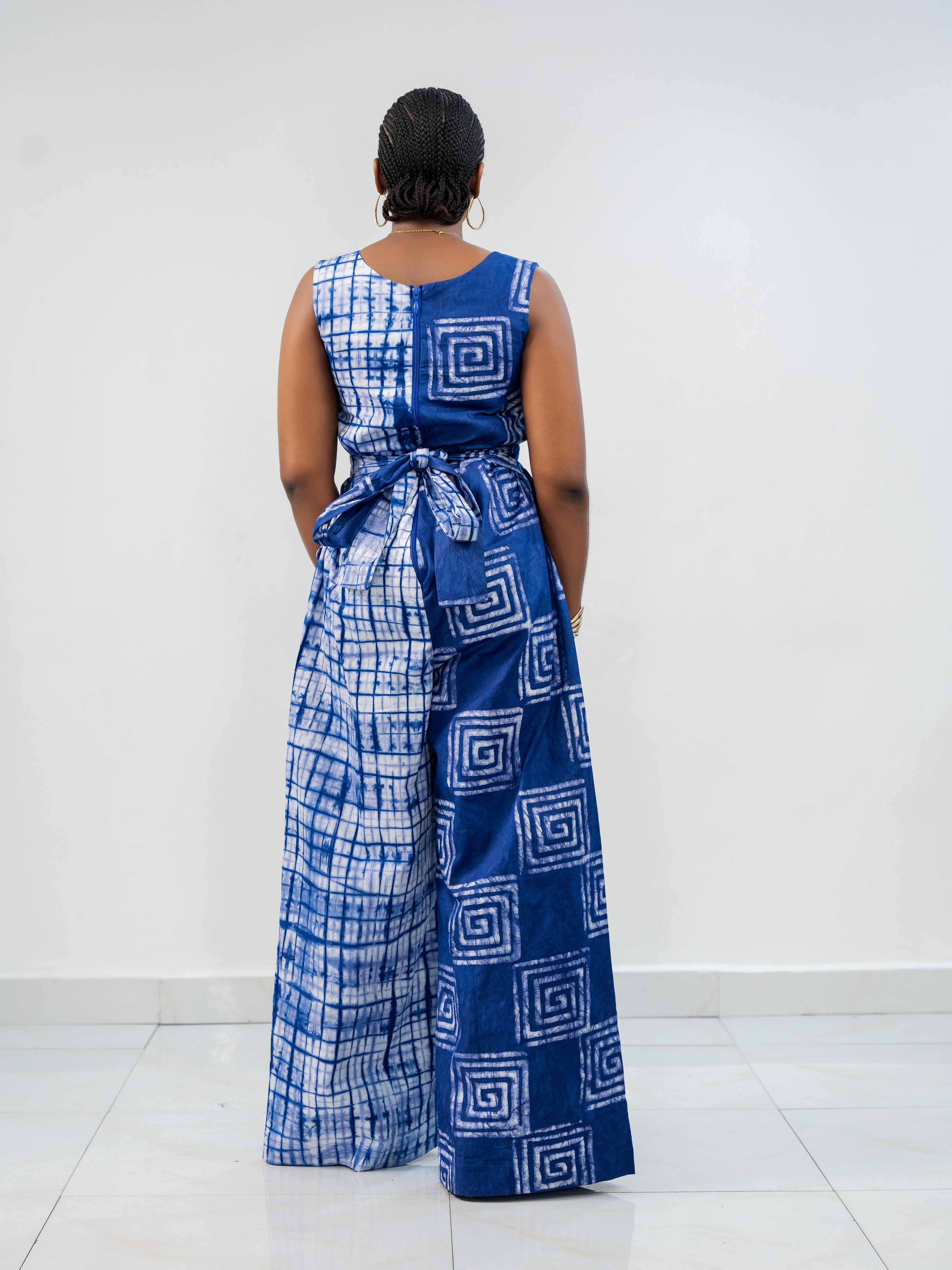 A vibrant Adire jumpsuit featuring a waist rope for a snatched, flattering fit. Sleeveless with wide legs for an easy, stylish silhouette.