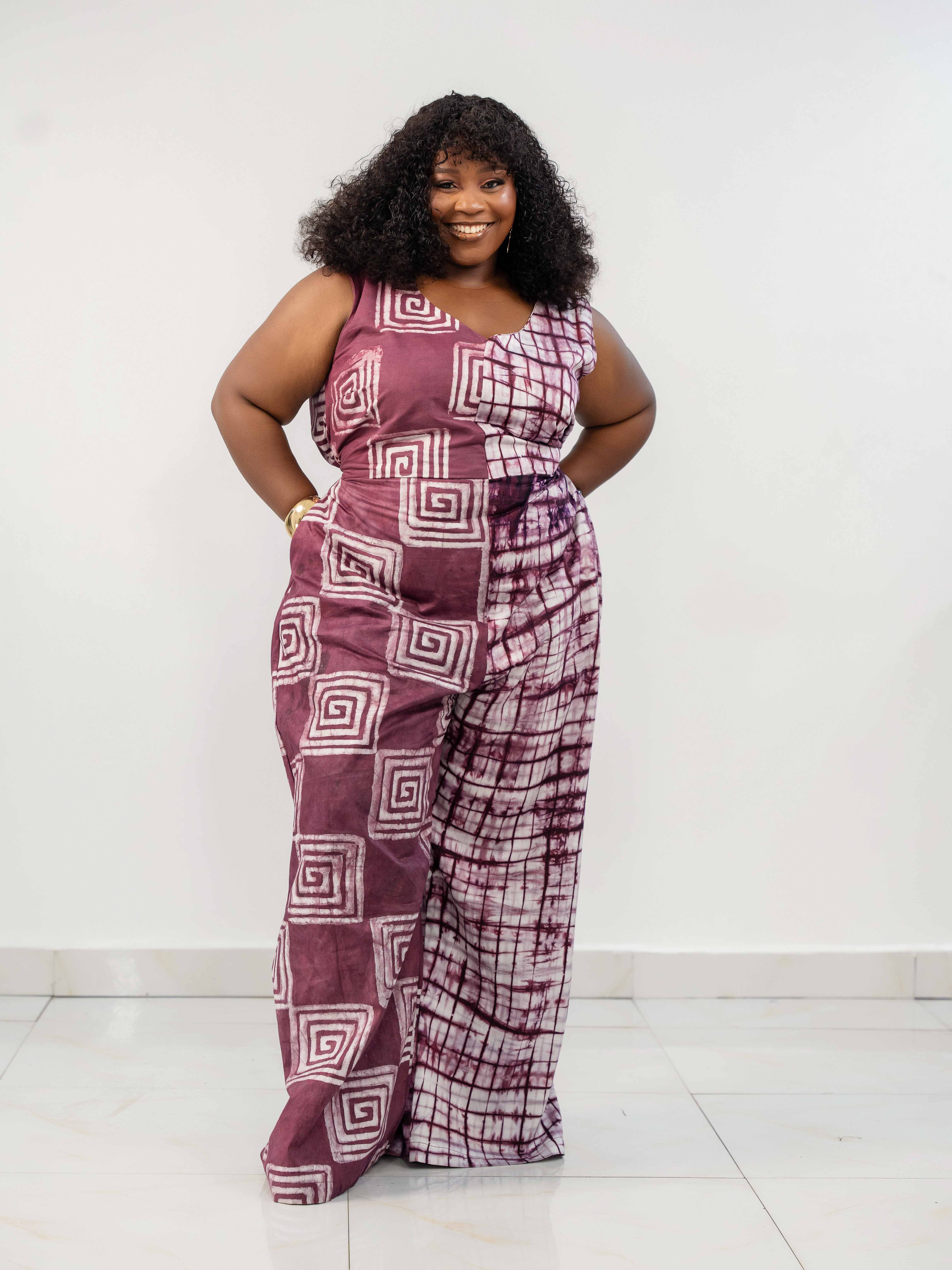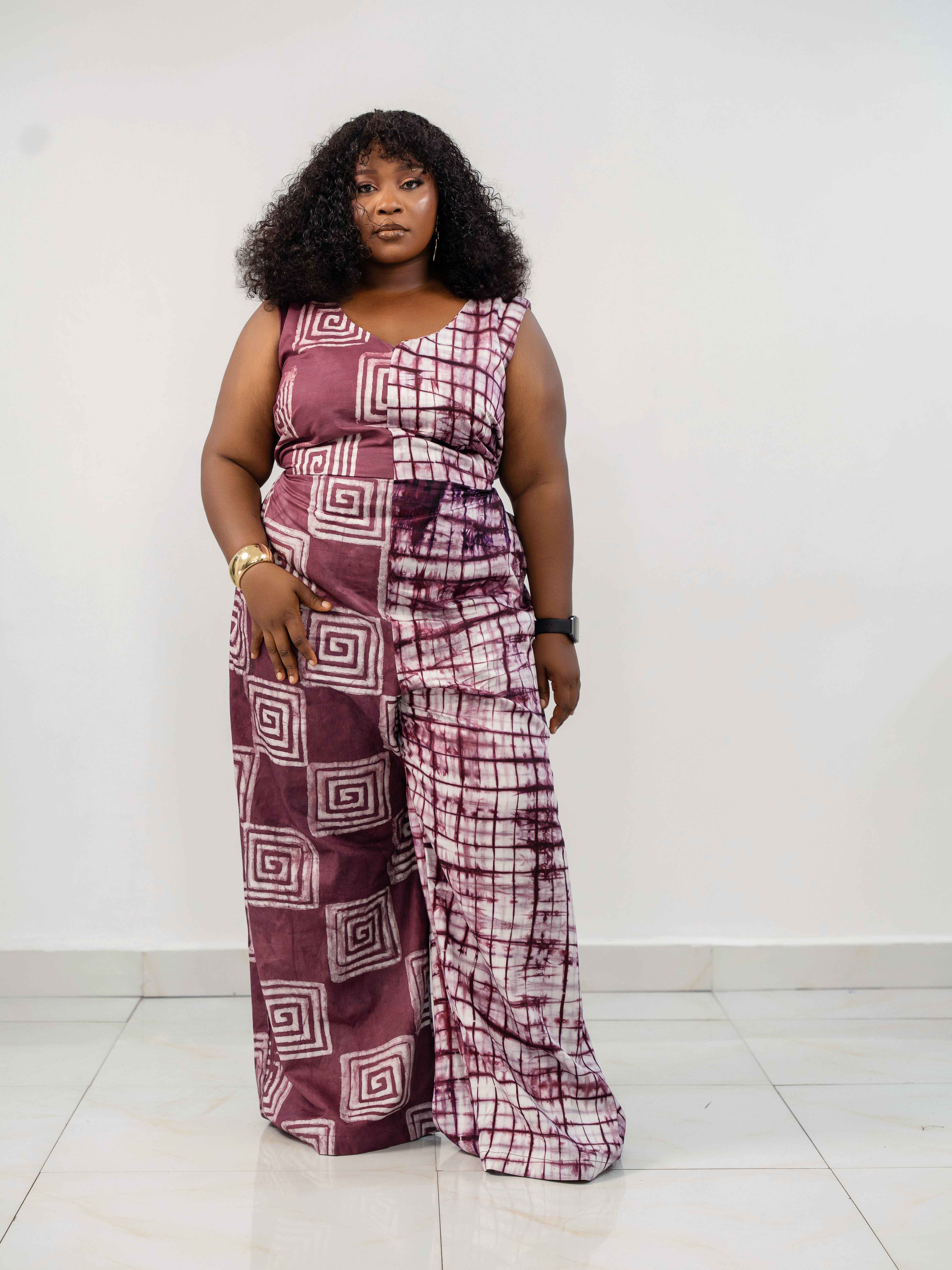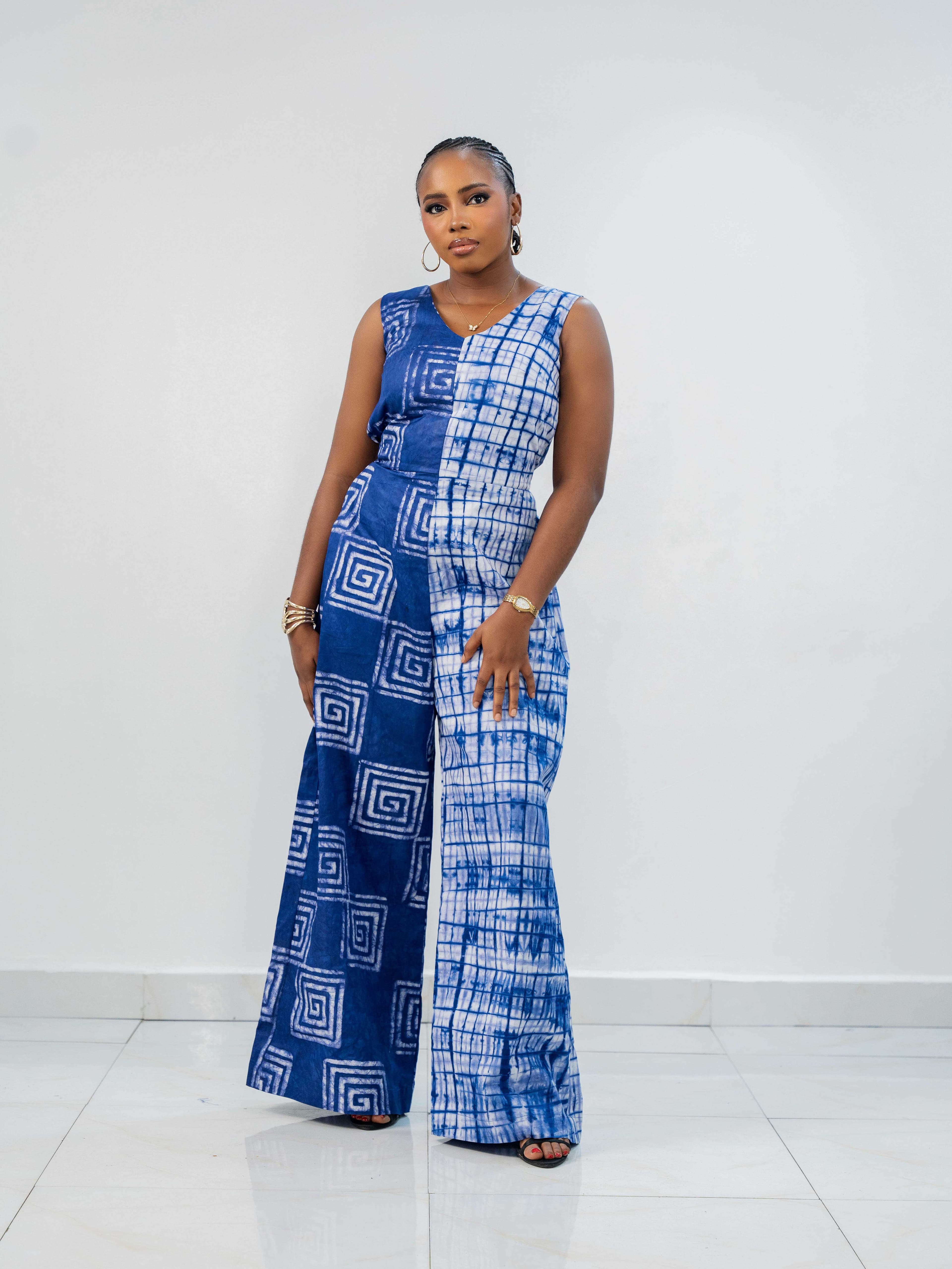 A vibrant Adire jumpsuit featuring a waist rope for a snatched, flattering fit. Sleeveless with wide legs for an easy, stylish silhouette.
