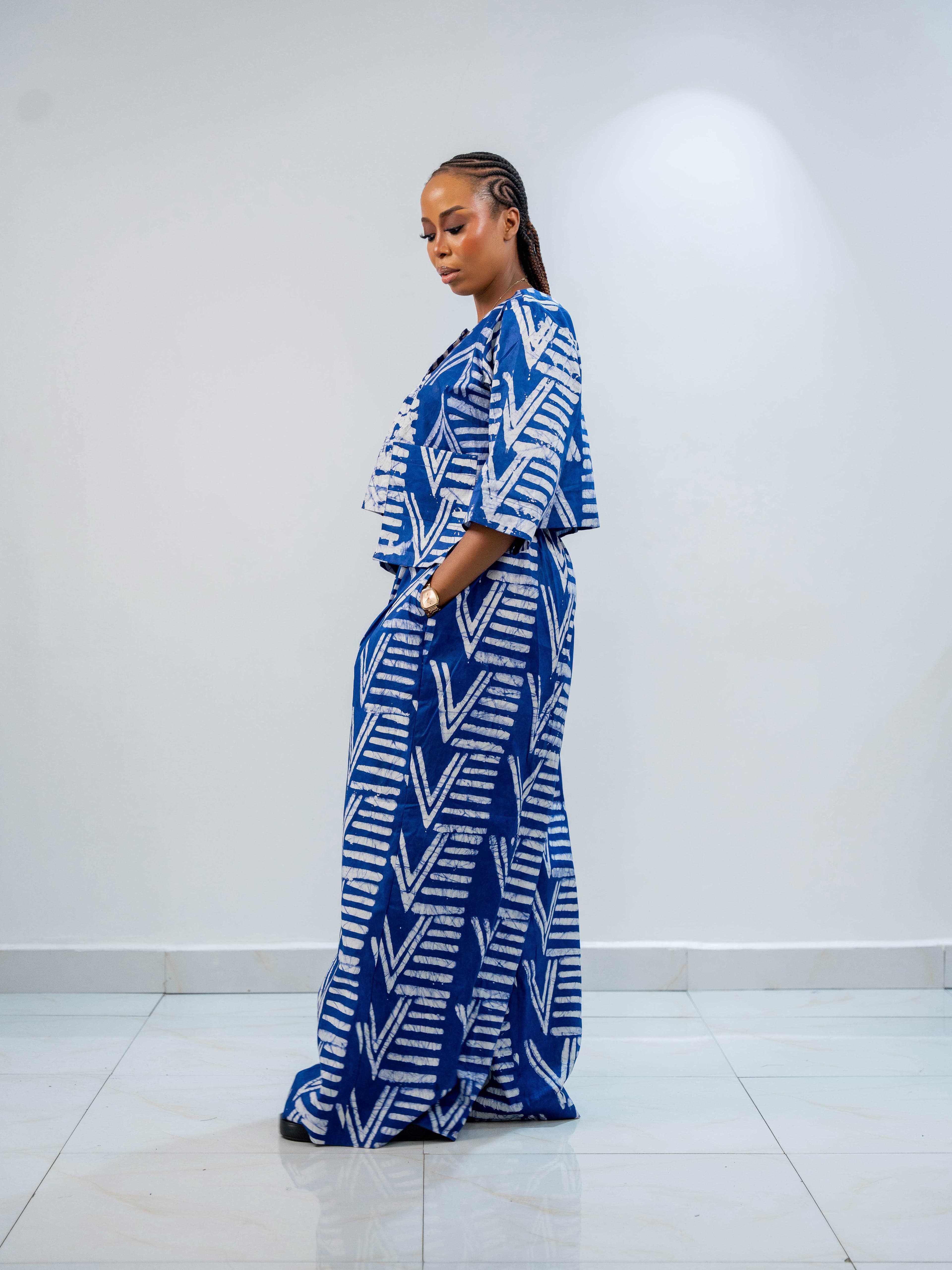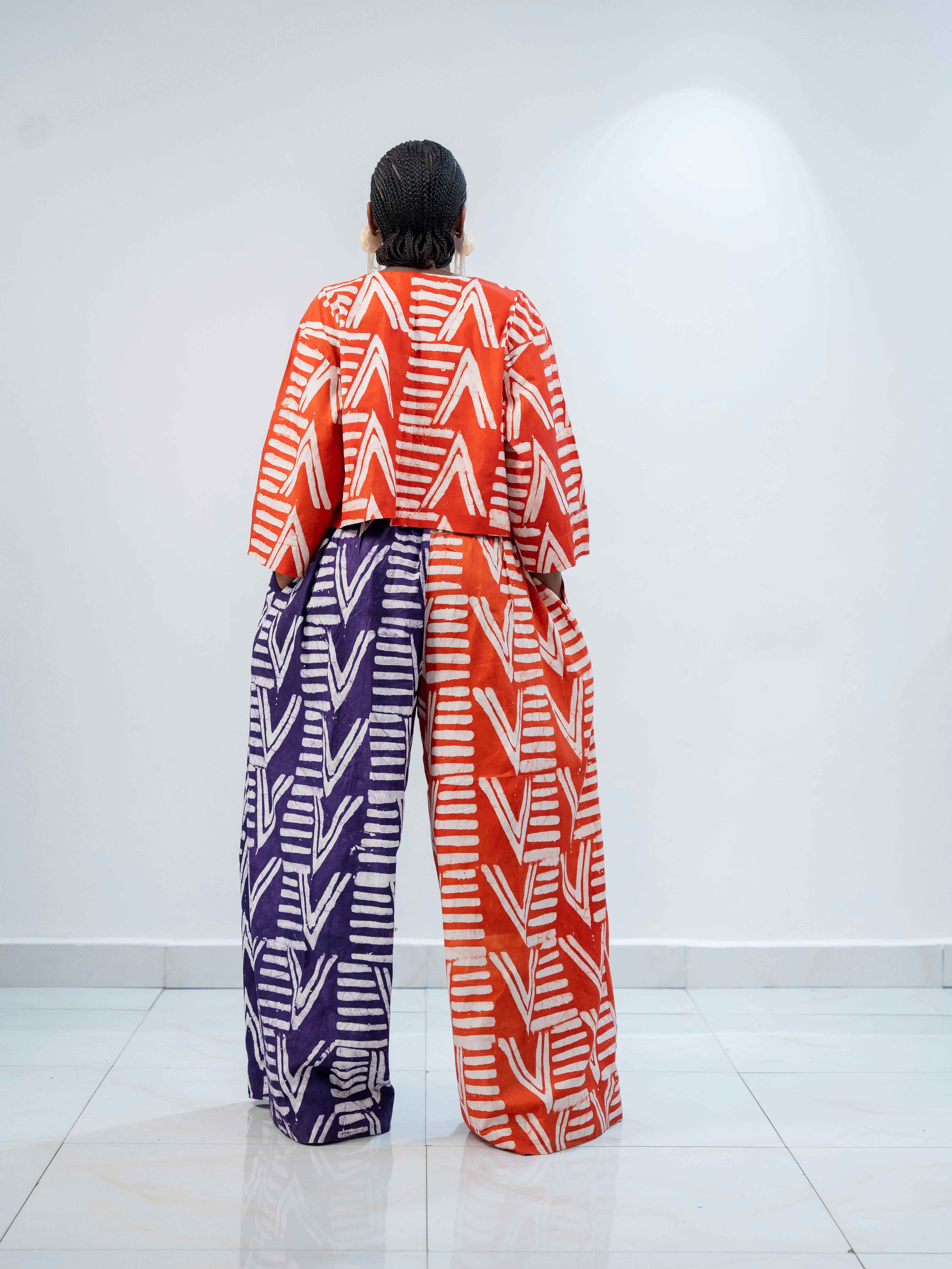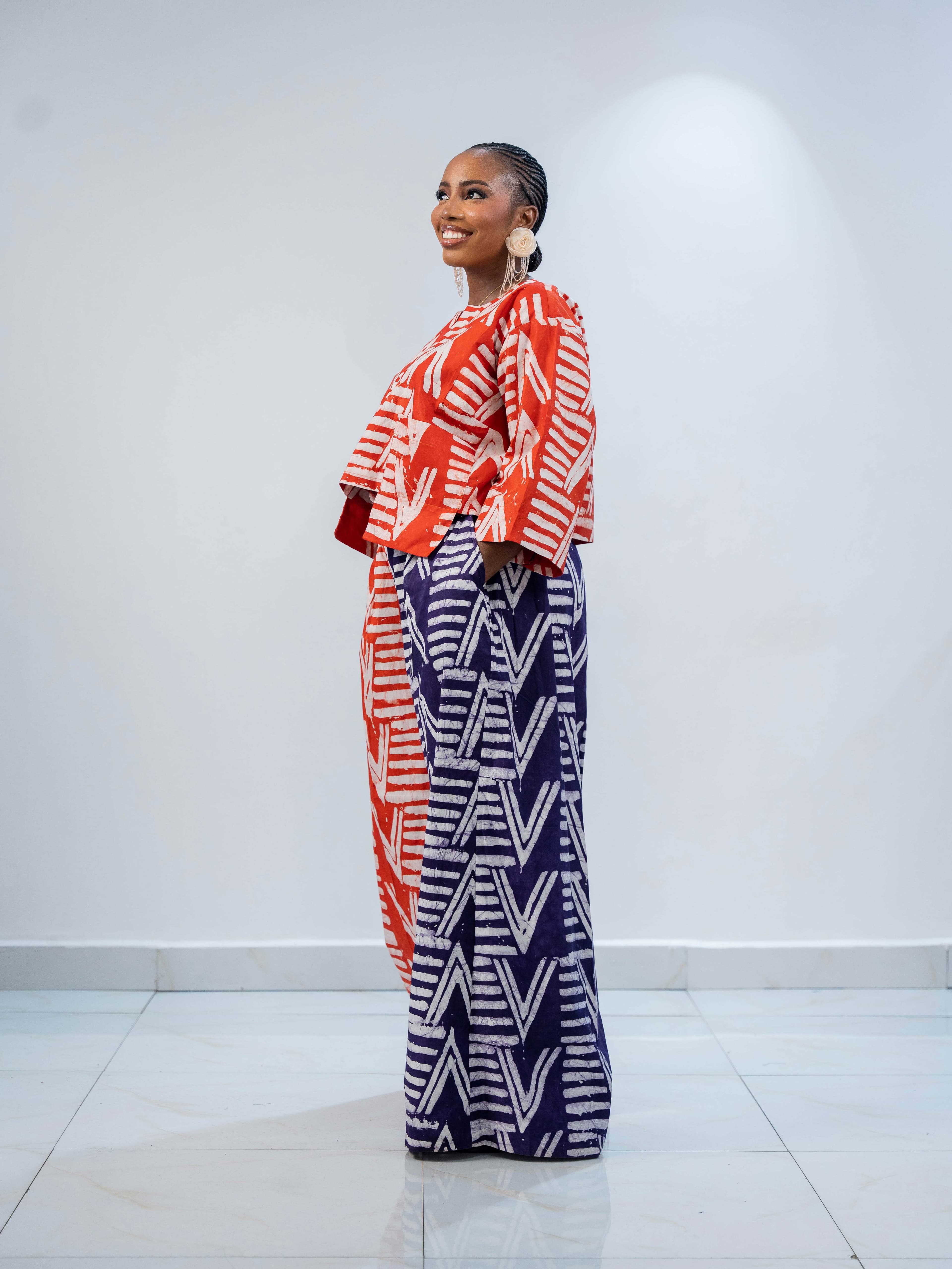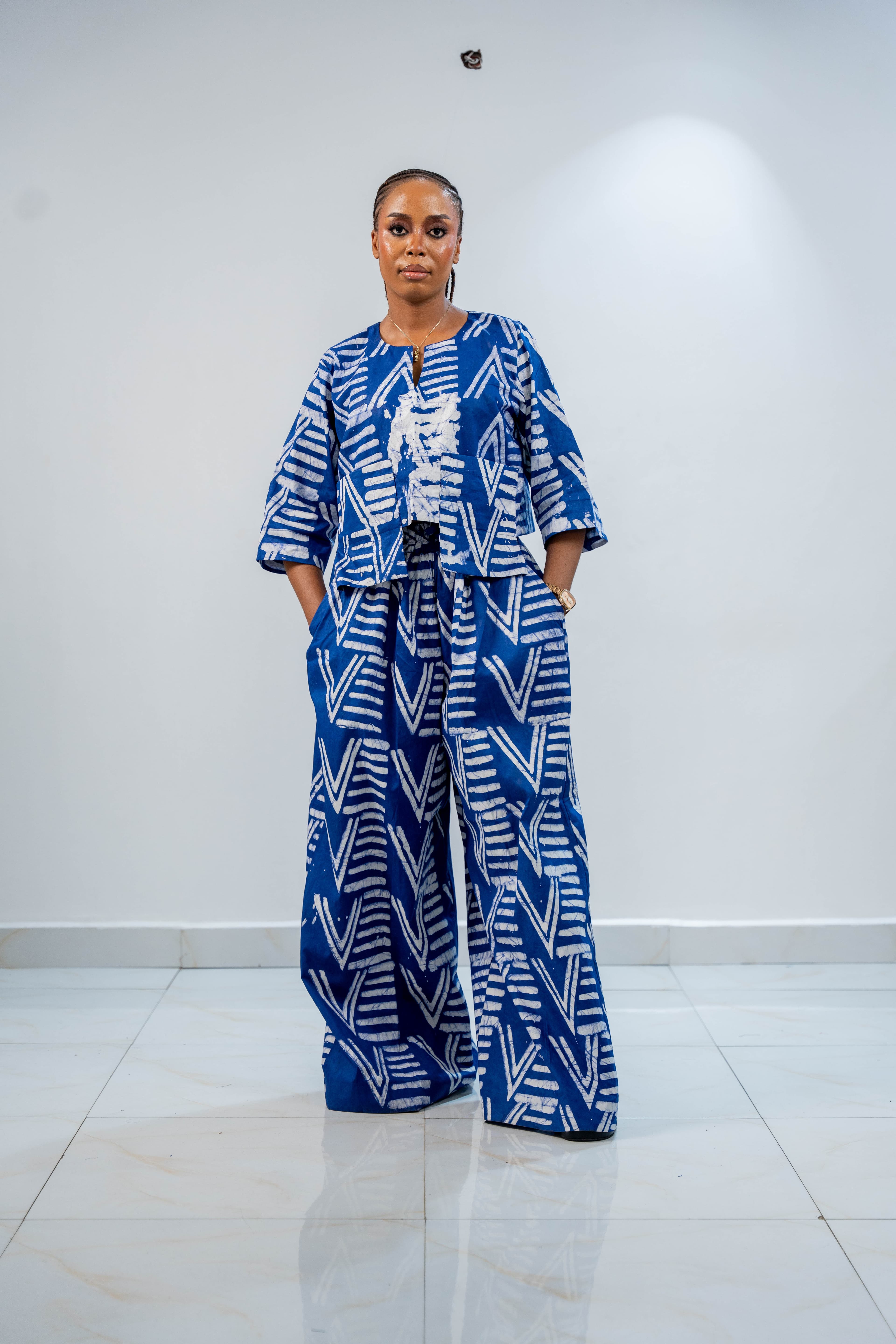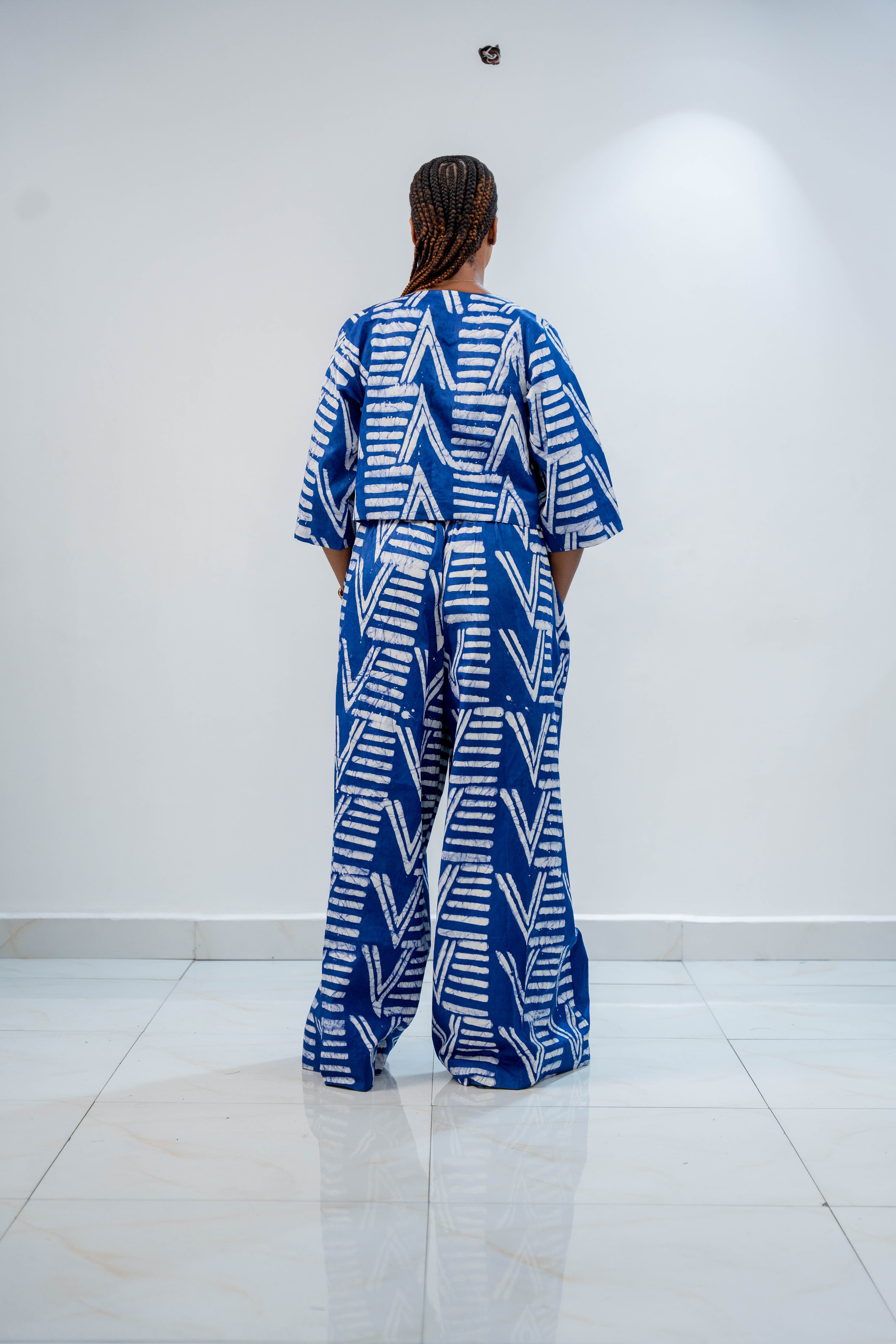 A stylish Adire set featuring a slit round-neck crop top with extended front pockets, paired with wide-leg trousers for a bold, easy, and modern look.