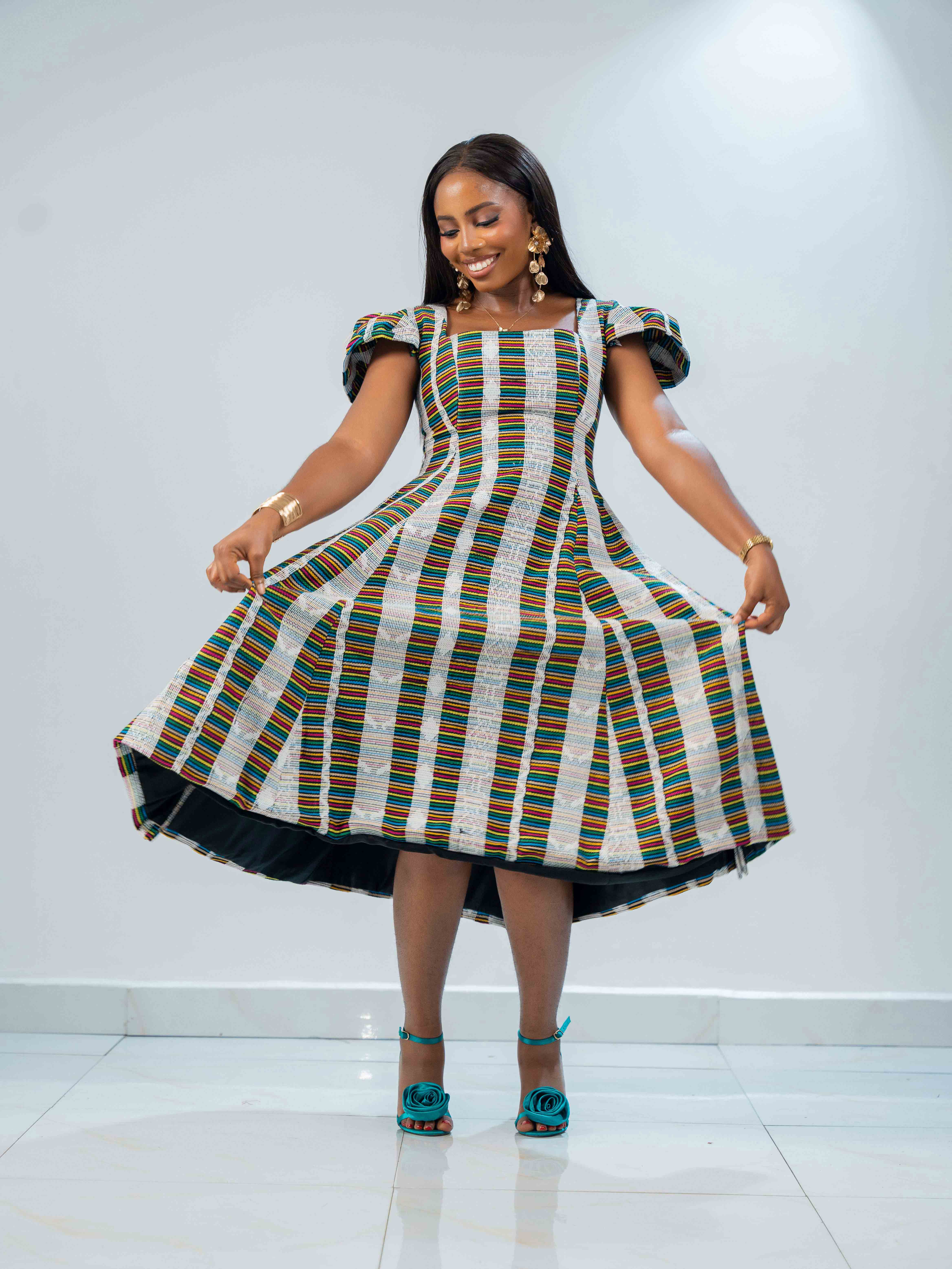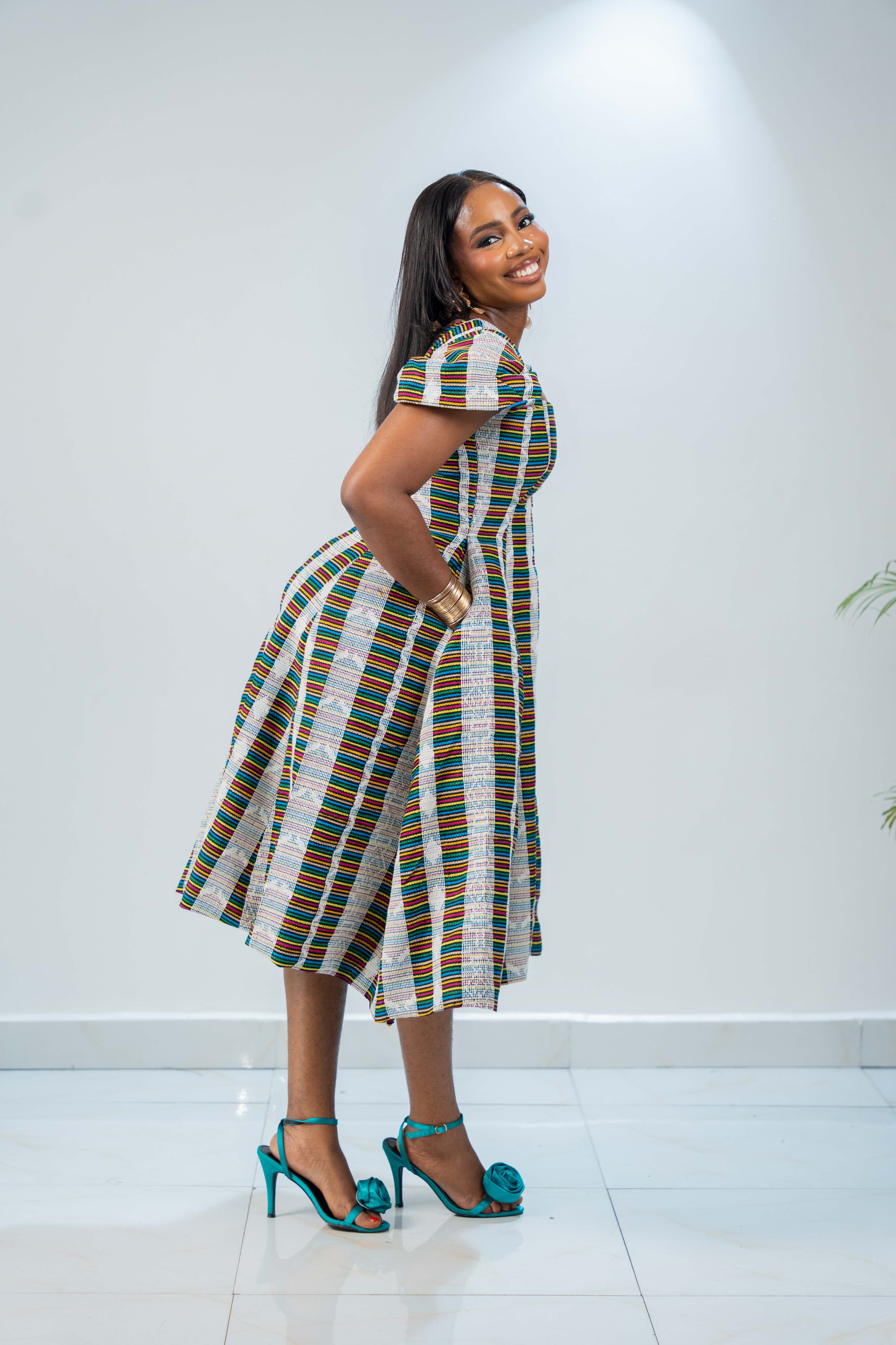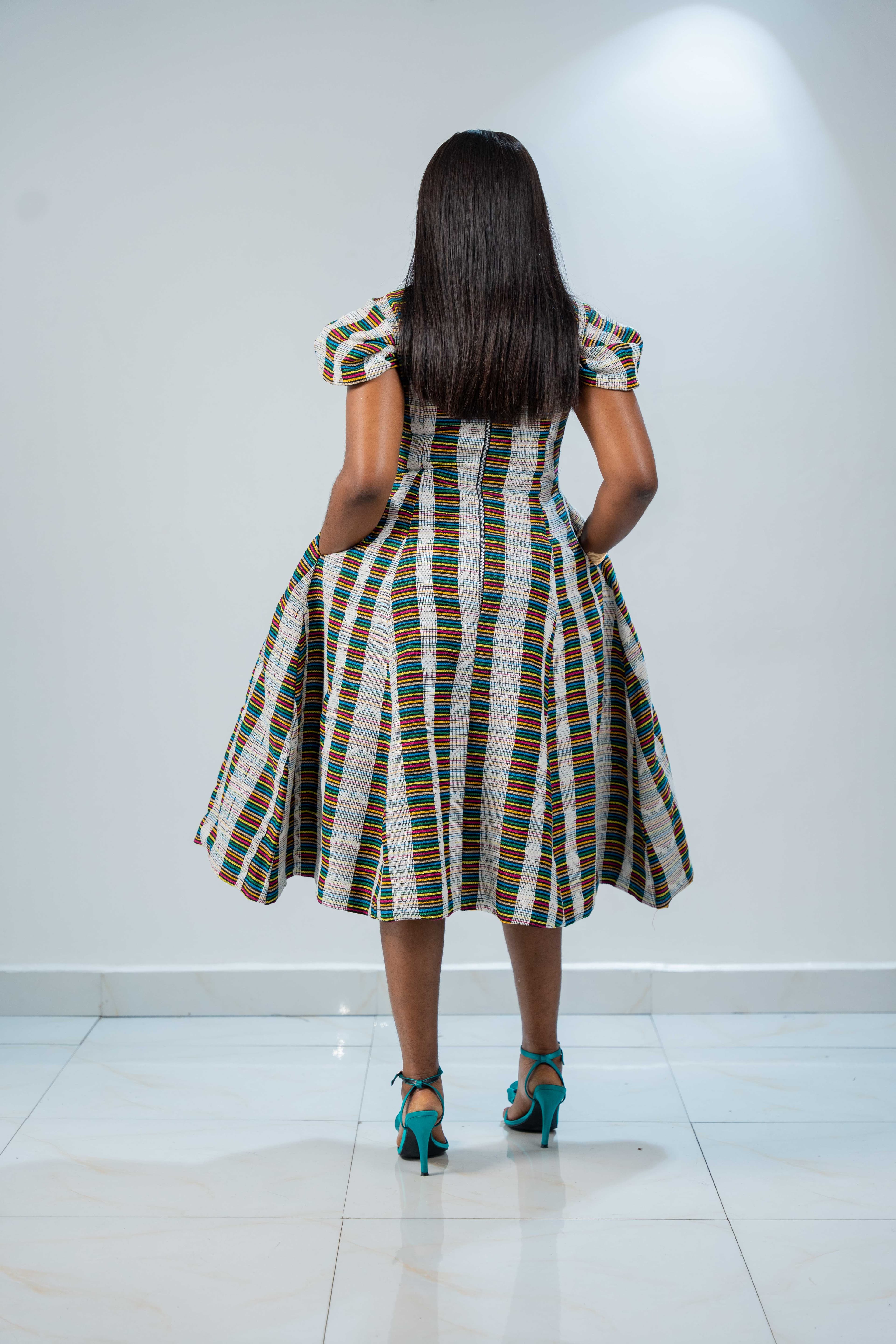 6 pieces dress with zipper and cup sleeve, made with Akwaete fabric in various beautiful prints. Akwaete is woven thick wool fabric, originated from Akwaete in Abia state.